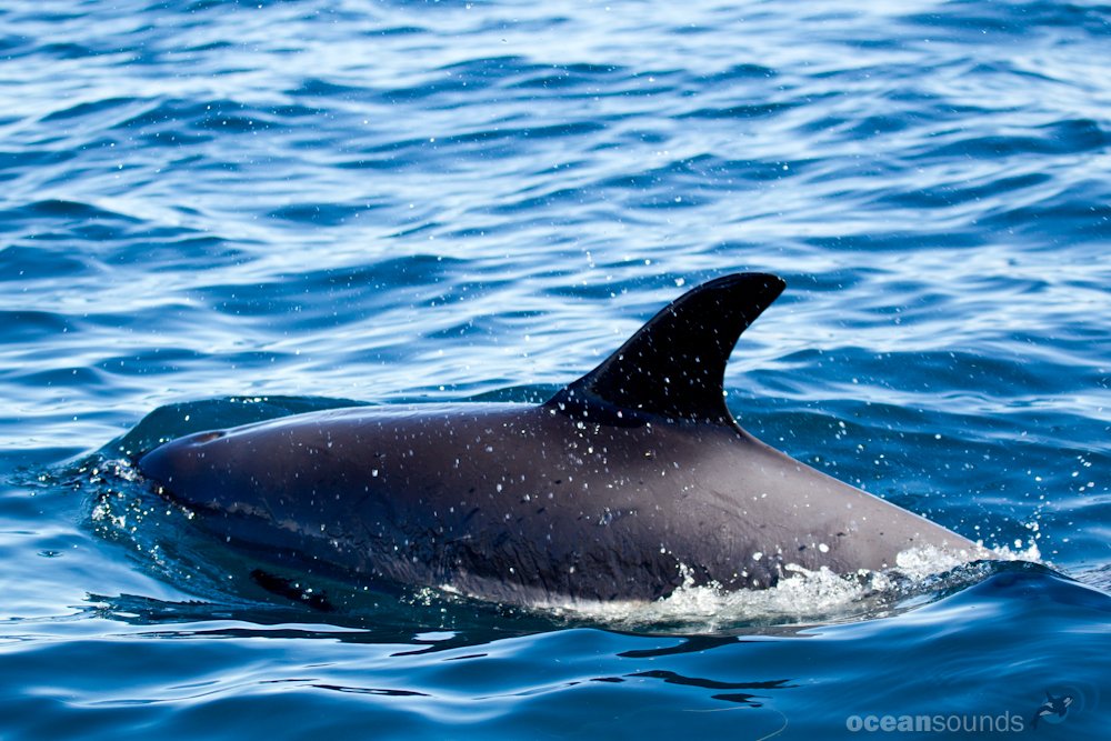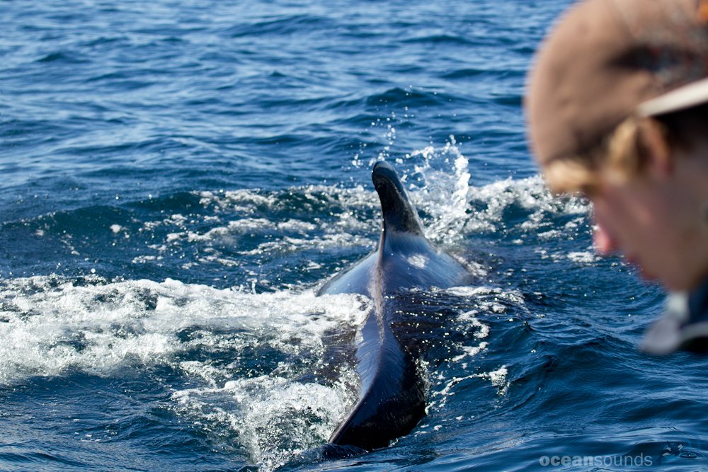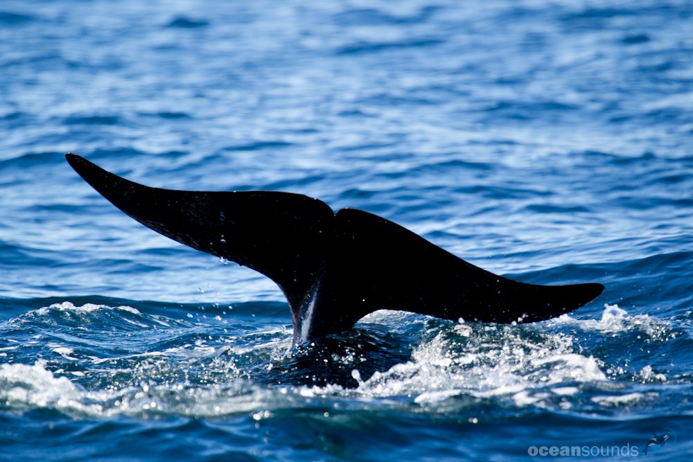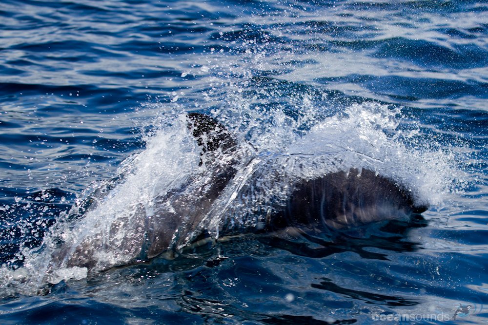 Oft sehen wir auch Atlantische Weisseitendelphine mit ihnen schwimmen vor allem wenn es Makrellen im Norden gibt. Letztes Jahr konnten wir zum ersten Mal filmen, wie die Delphine Makrellen jagten. Ob sich Grindwale auch an Makrellen vergreifen wissen wir nicht, sie tauchen meist sehr tief und lange, um nach Tintenfische zu suchen, dabei schwimmen sie oft direkt auf unser stehendes Boot zu und tauchen alle gemeinsam direkt unter unserem Boot ab (siehe vorletzte Photos), und kommen erst nach ca 10 Minuten wieder an der gleichen Stelle hoch, siehe letzten beiden Photos! Während dieser tiefen Tauchgängen benutzen sie Ech-ortung (Klicklaute), um die Beute und auch die Struktur des Bodens zu erkennen, dabei halten sie auch immer Kontakt durch Rufe, was man gut auf der folgenden Aufnahme hören kann (leider mit Schiffslärm im Hintergrund, das ist “normal” im Vestfjord)