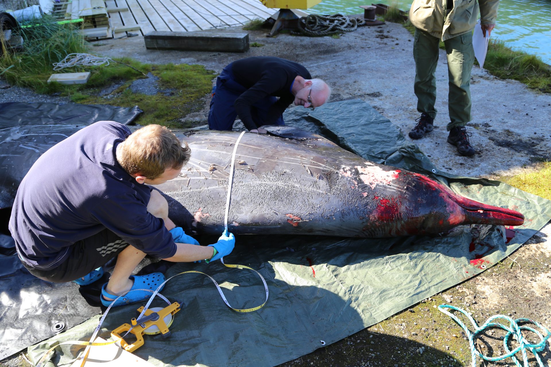 A dissection showed no signs of injury or disease. His organs, muscles, and blubber were in good condition. His stomach contained 120 fish otoliths (fish ear bones), mostly from the Gadiculus (cod fish) and Trisopterus (pout fish) genera. This shows that the whale had been actively feeding and was not starving, and no plastic or other foreign material was found in his stomach or intestines. No clear cause of death was determined.